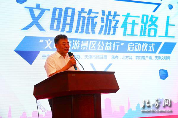 启动仪式上,天津市旅游局副局长佟景正在充分肯定本次活动的同时,也倡导旅游企业、从业者及广大市民游客从自身做起,争做文明旅游的引领者和践行者,真正肩负起文明旅游的职责,建立和完善文明旅游工作的长效机制。